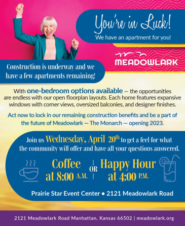 Thinking of moving to Meadowlark? Join us for happy hour at 4 p.m. Wednesday, April 20, to get a feel for what The Monarch at Meadowlark will offer and have all your questions answered.