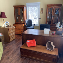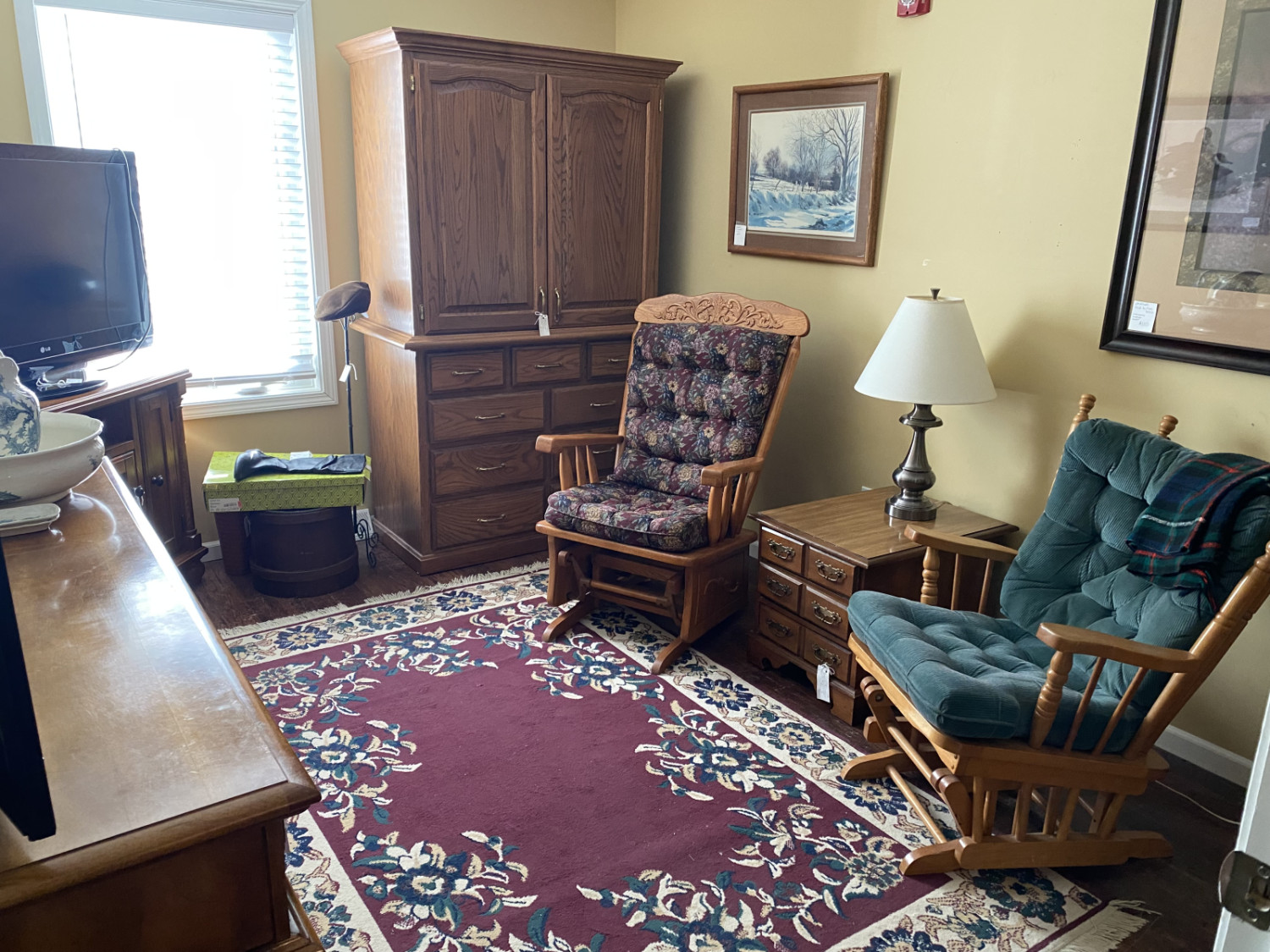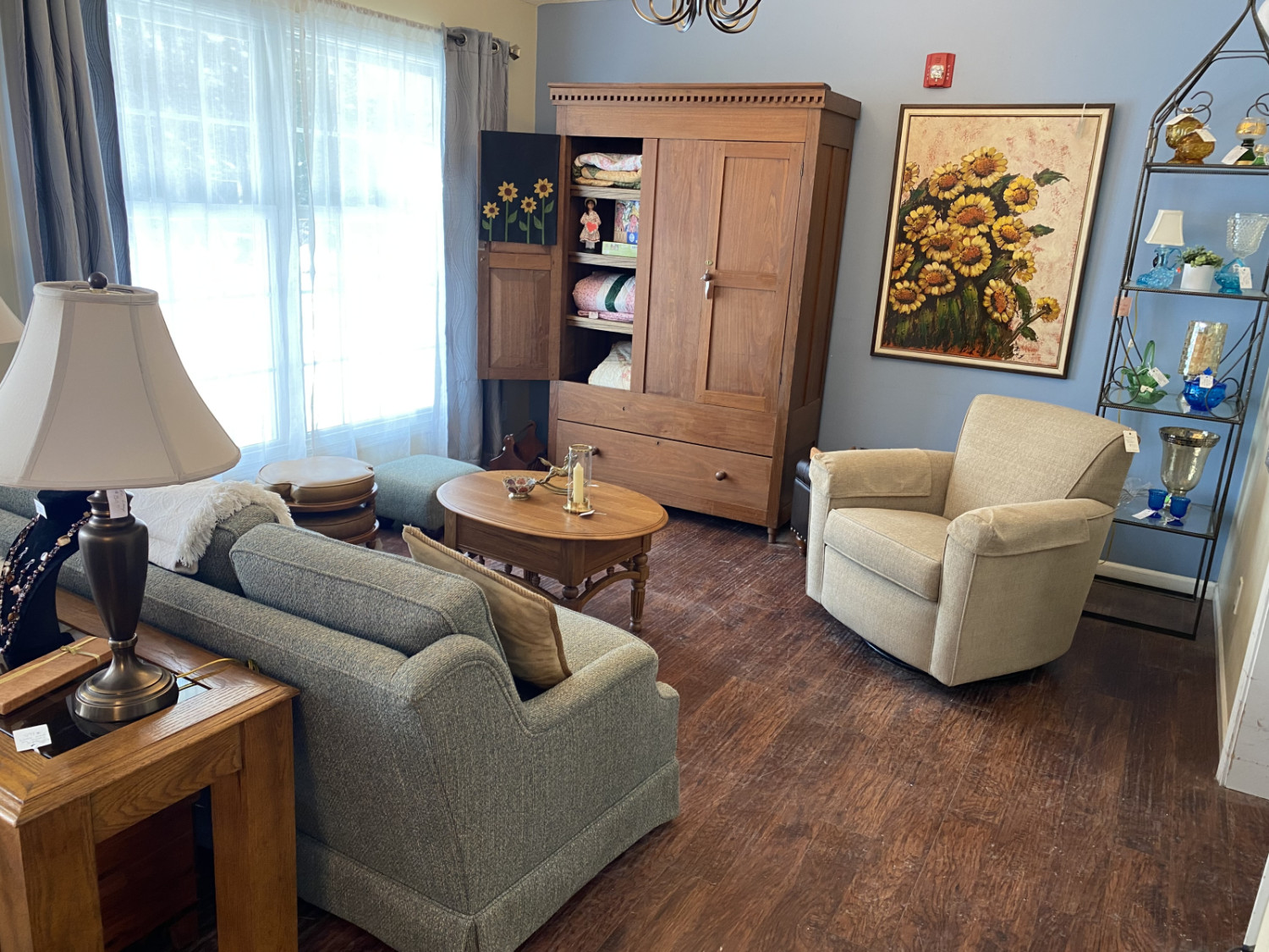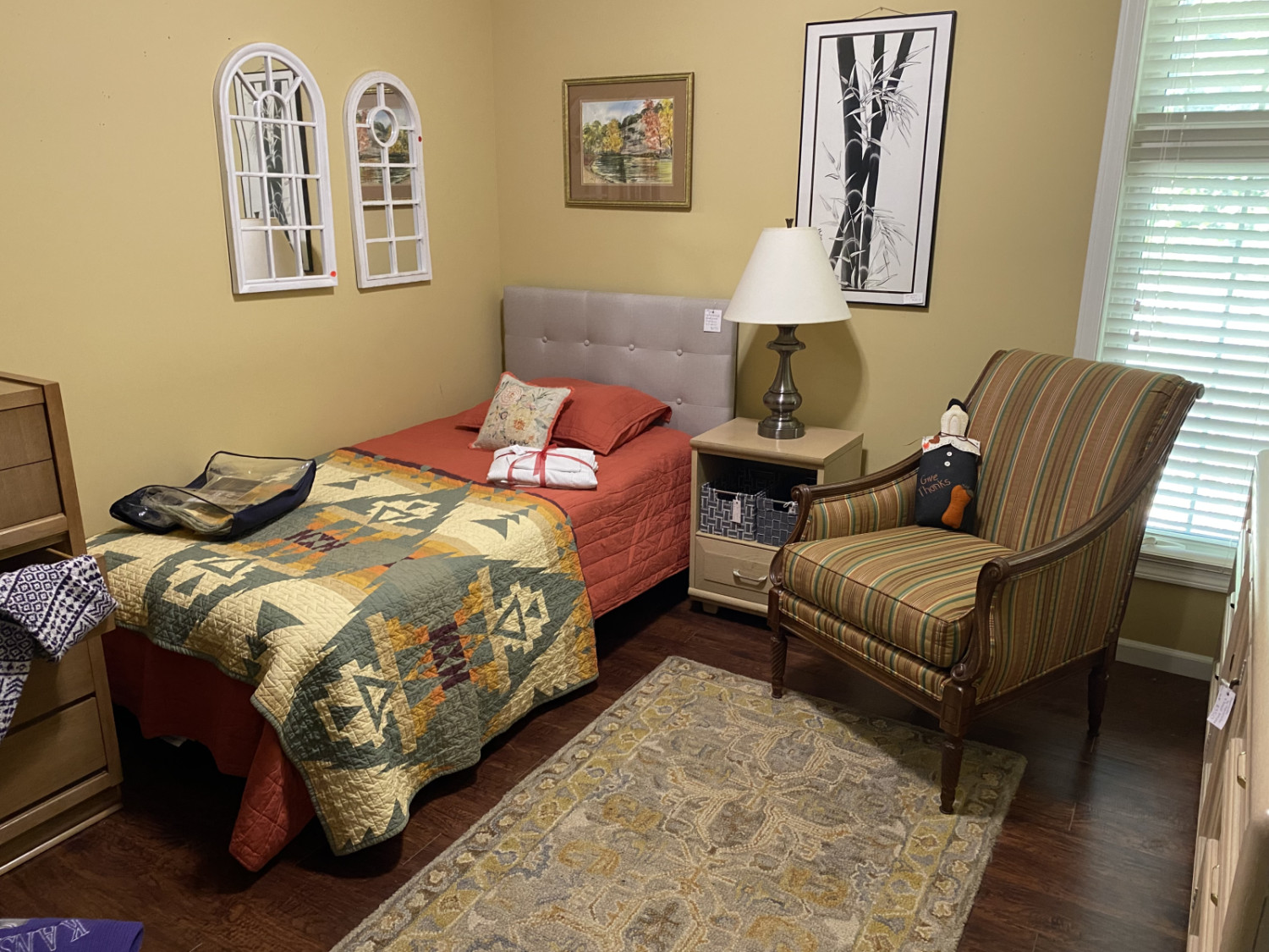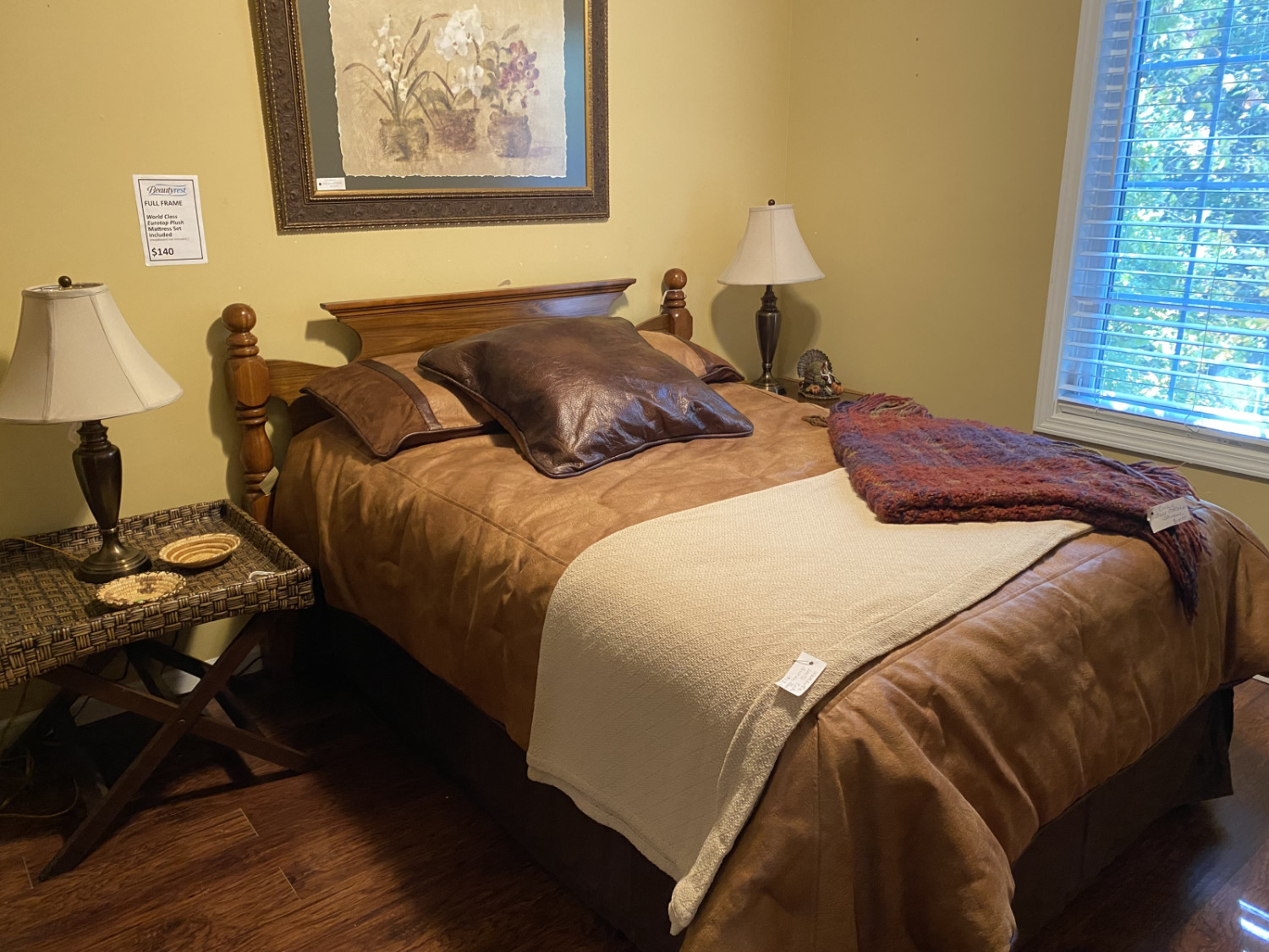 Market items currently are displayed on the main floor of a large five-bedroom/two-bath house, similar to how they’d be arranged in a home. For example, cookware, dinnerware, drinking glasses, and flatware sets are in the kitchen or dining room, while sofas, chairs, end tables, and storage pieces are usually in the living area. Dressers, chests of drawers, beds, and nightstands are often in four bedrooms; a fifth bedroom is usually stocked with office furniture. The home’s large screened-in porch also holds items with price tags.