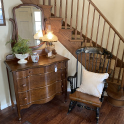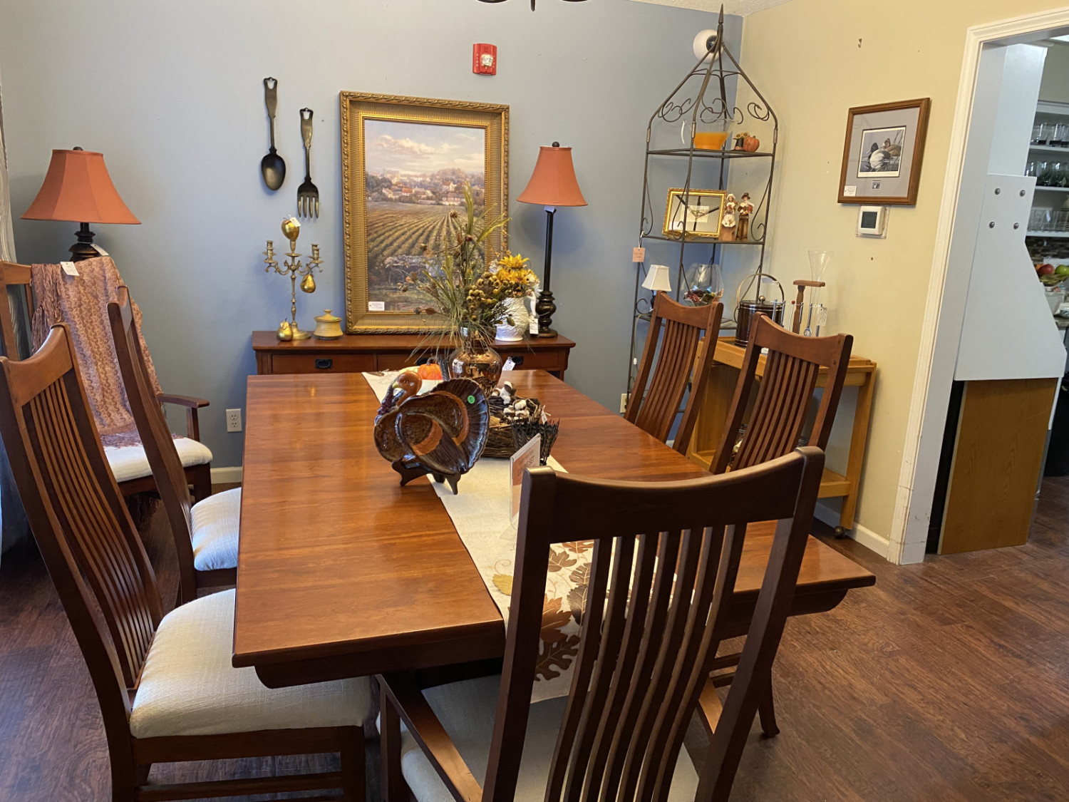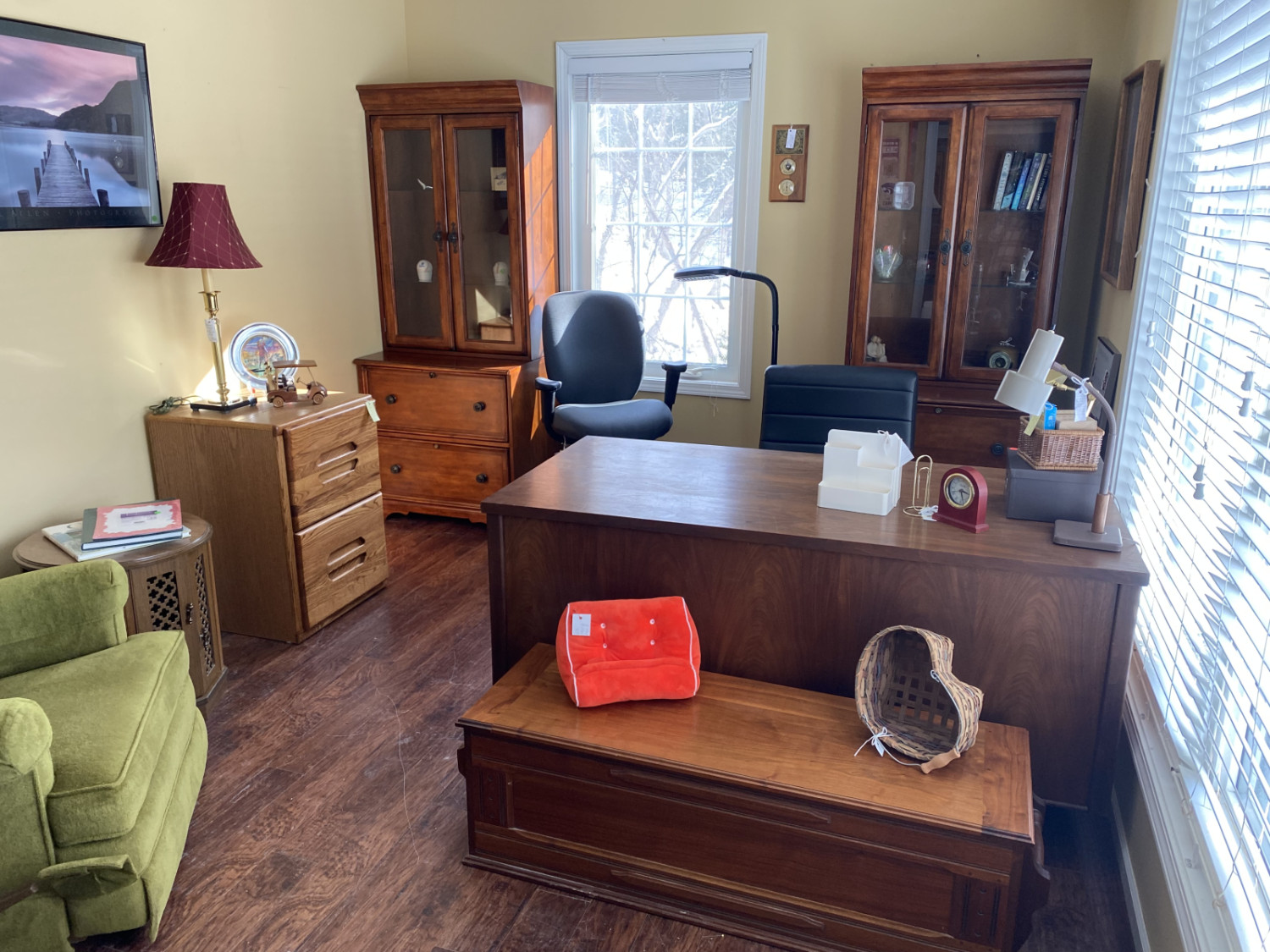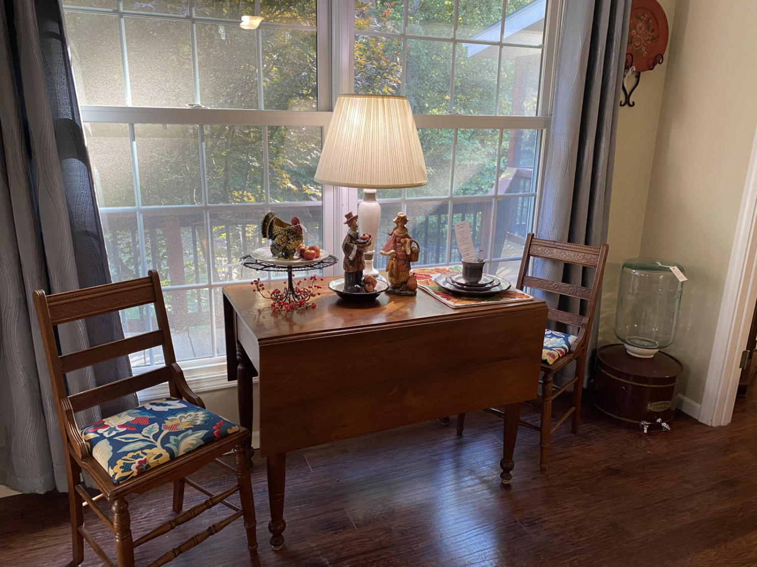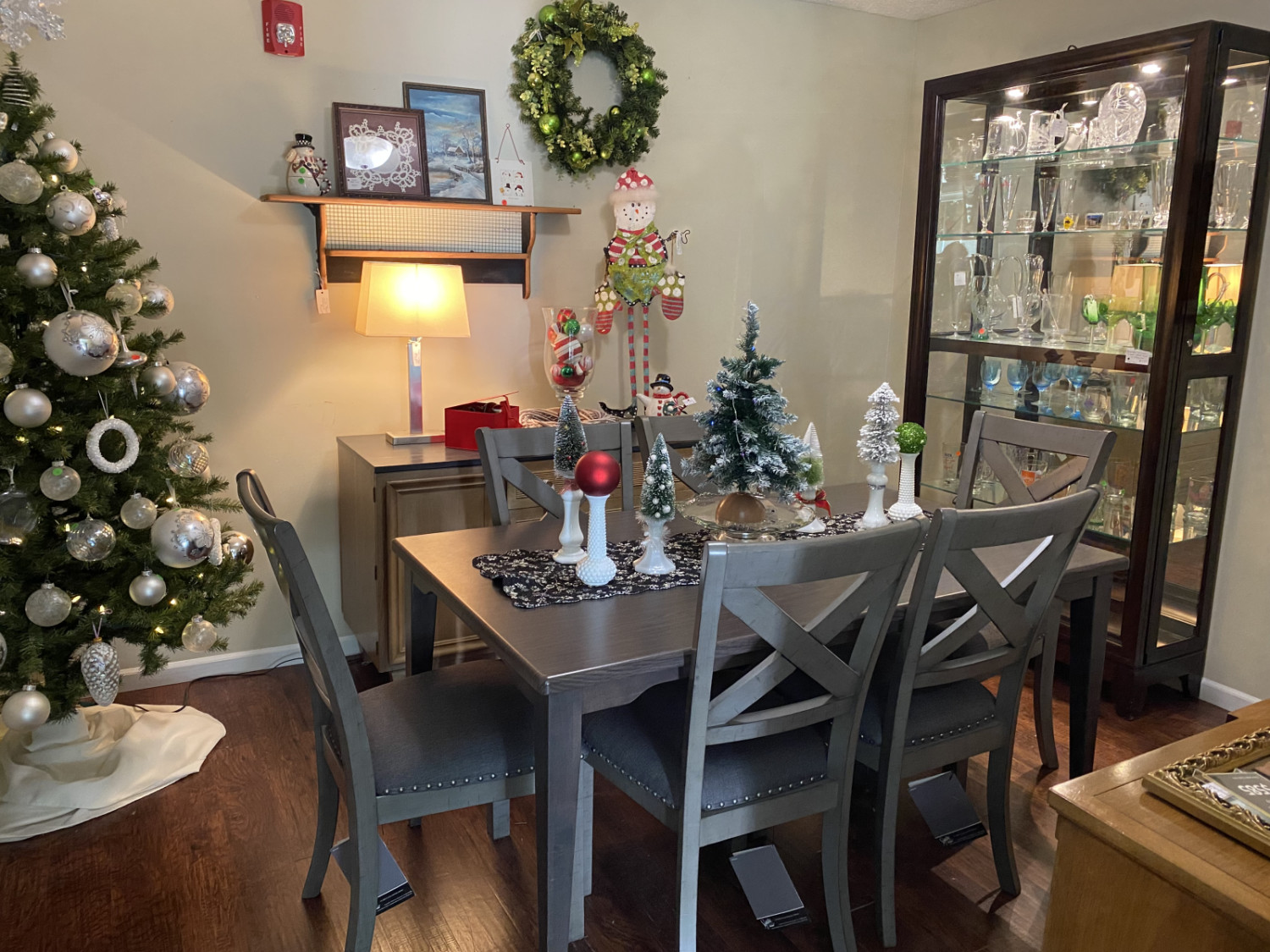 Market items currently are displayed on the main floor of a large five-bedroom/two-bath house, similar to how they’d be arranged in a home. For example, cookware, dinnerware, drinking glasses, and flatware sets are in the kitchen or dining room, while sofas, chairs, end tables, and storage pieces are usually in the living area. Dressers, chests of drawers, beds, and nightstands are often in four bedrooms; a fifth bedroom is usually stocked with office furniture. The home’s large screened-in porch also holds items with price tags.