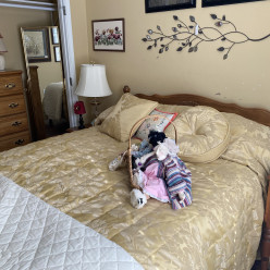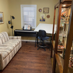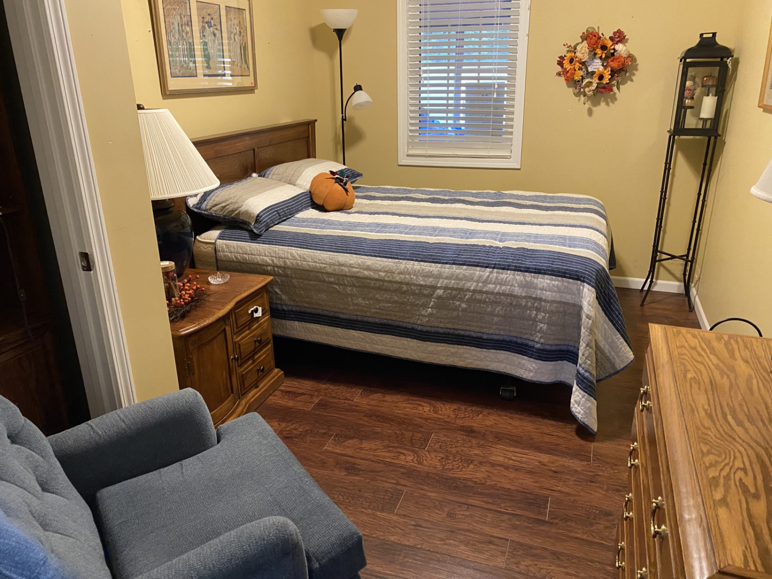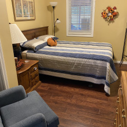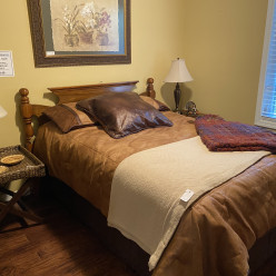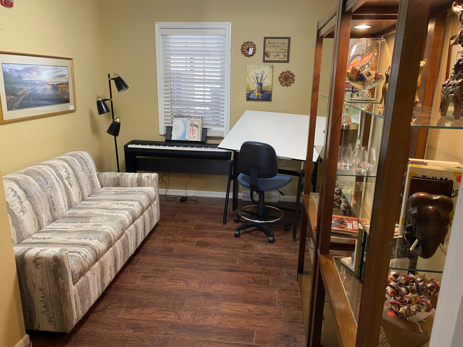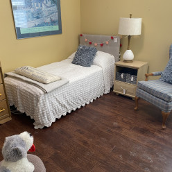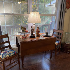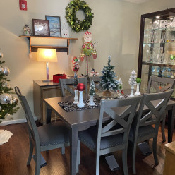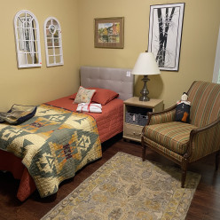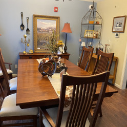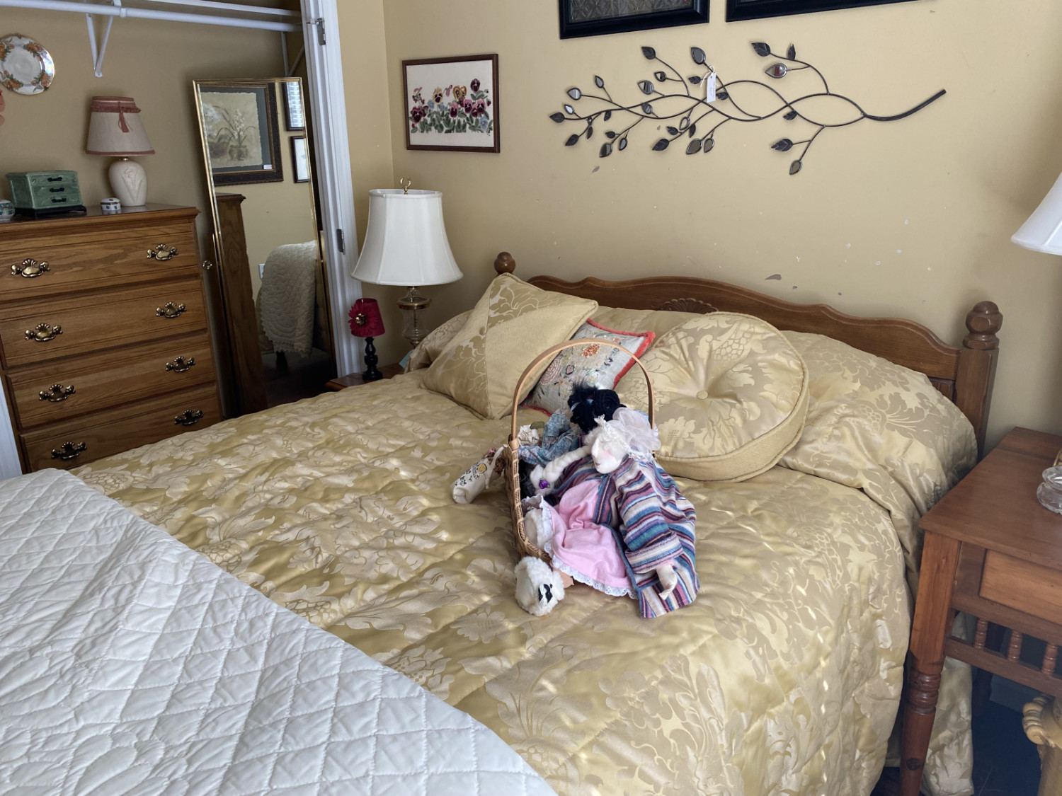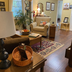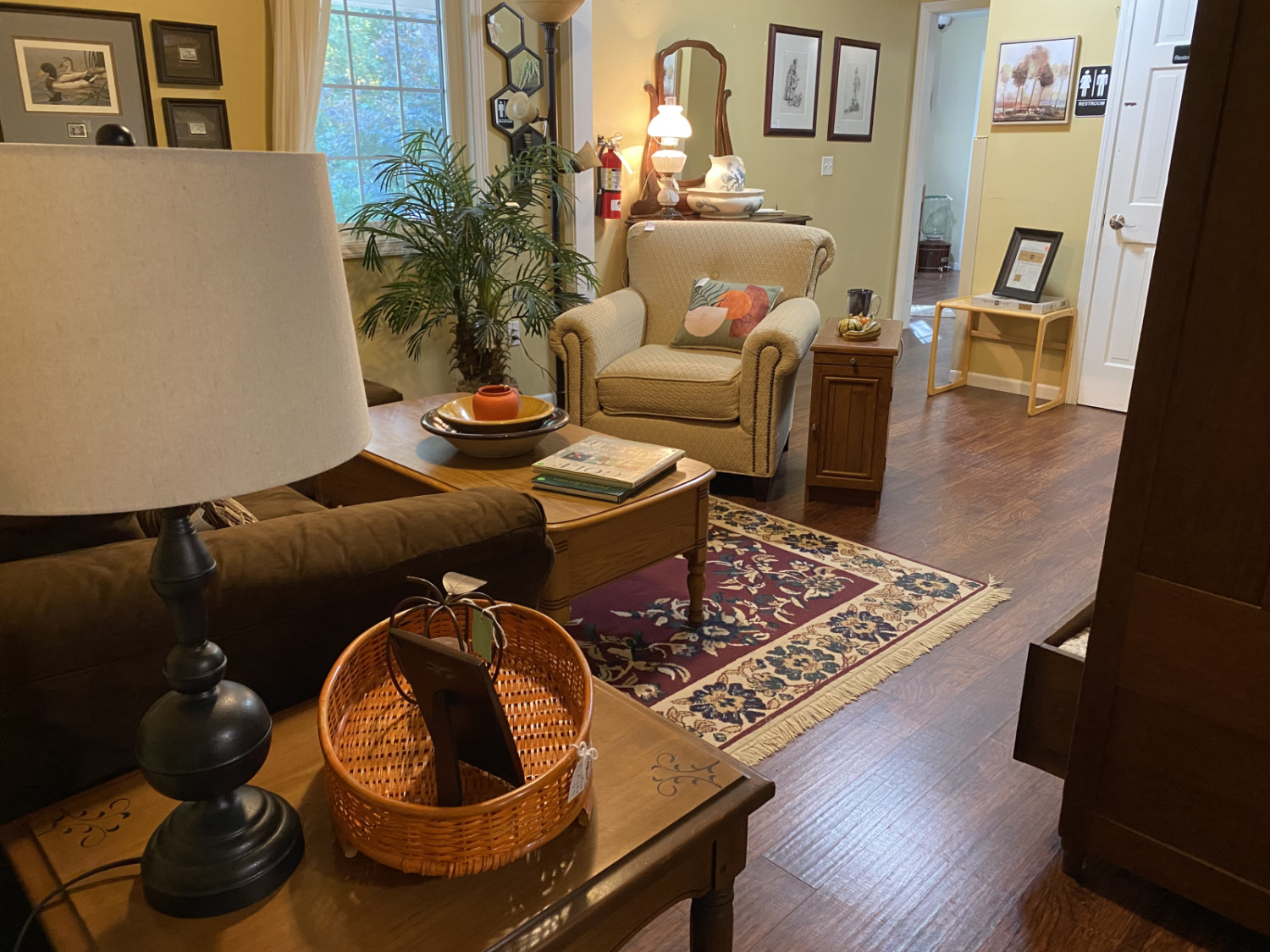 Market items currently are displayed on the main floor of a large five-bedroom/two-bath house, similar to how they’d be arranged in a home. For example, cookware, dinnerware, drinking glasses, and flatware sets are in the kitchen or dining room, while sofas, chairs, end tables, and storage pieces are usually in the living area. Dressers, chests of drawers, beds, and nightstands are often in four bedrooms; a fifth bedroom is usually stocked with office furniture. The home’s large screened-in porch also holds items with price tags.